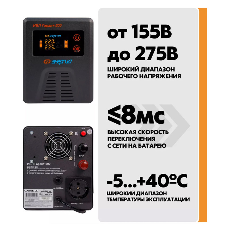 Характеристики Комплект ИБП Энергия Гарант 500 + Аккумулятор Vektor Energy GPL 12-40
