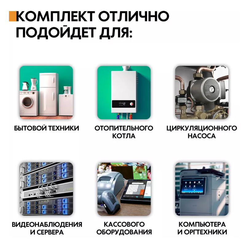 Готовый комплект для обеспечения питания, в случае отключения централизованной сети. В качестве накопителя энергии в данной системе используется АКБ 12V. В момент отключения основного источника питания, UPS автоматически и мгновенно переключается на работу от аккумулятора, обеспечивая непрерывное питание подключенным устройствам. Когда основное питание восстанавливается, ИБП переключается на него и одновременно начинает заряжать аккумулятор. В состав данной системы резервирования входит источник бесперебойного питания Энергия Гарант 500, который имеет различные функции, такие как защита от короткого замыкания, перегрузки и высокого/низкого напряжения и аккумулятор 12V 40 Ампер модели Vektor Energy GPL 12-40, выполненный по технологии AGM и не требующий обслуживания. Такой комплект бесперебойного питания отлично подойдет для обеспечения энергией Вашего газового котла или насоса, а также для других приборов, чувствительных к качеству питающего напряжения, таких как аудио-видео аппаратура, компьютеры и телекоммуникационное оборудование.